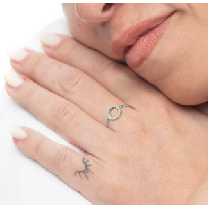 Anello in acciaio a fascetta con elemento a cerchio con cubic zirconia bianchi. Nella parte interna vicino all' infinito laserato il logo Marlù e nella parte inferiore è incisa la scritta "SPARKLE forever". Materiale: acciaio, cubic zirconia