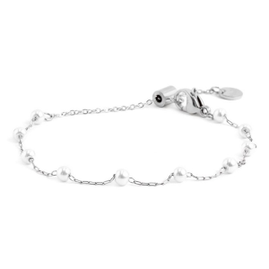 Bracciale in acciaio con catena con perle bianche rivestite con diametro 3,30 mm. Lunghezza totale 19 cm regolabile tramite cursore da 19 cm a 15 cm. Disponibile in acciaio, acciaio con pvd oro