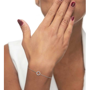 Bracciale in acciaio con catena cutting cross con al centro un elemento a cerchio con cubic zirconia bianchi. Vicino al moschettone si trova una tag ovale con scritta "SPARKLE forever" su un lato e il logo Marlù sull'altro lato. Lunghezza totale 19 cm regolabile tramite cursore. Cubic zirconia bianco presente all' estremità. Materiali: acciaio, cubic zirconia
