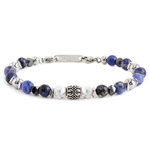 Bracciale con al centro cilindro in acciaio con texture in black oil, alternate elementi e sfere di ematite lucida, sfere di sodalite, elementi di ematite scura. Lunghezza totale 21 cm, regolabile da 21 cm a 19,2 cm tramite logo tag Marlù removibile in acciaio. Collezione: NAM02 Materiali: acciaio lucido, sodalite, ematite lucida, ematite scura