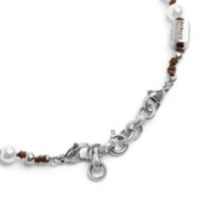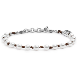 Bracciale con cordino marrone a nodi con perle rivestite da 6 mm, con finiture in acciaio. Ad una estremità elemento rettangolare in acciaio con trama con black oil, sul fronte il logo Marlù, sul retro la parola Namastè. Chiusura con moschettone su entrambi i lati. Estensione con catena rolò con trama, removibile e/o regolabile tramite moschettone tondo al centro. Lunghezza totale 22,6 cm, regolabile da 22,6 cm a 19 cm