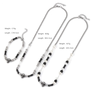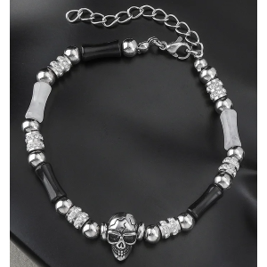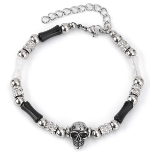 Bracciale è composto da perline nere lucide (onice), e perline bianche (agata) con inserti di perline in acciaio inossidabile e il teschio centrale. Il design combina elementi gotici, punk con uno stile di perline classico, rendedolo un accessorio verstale.