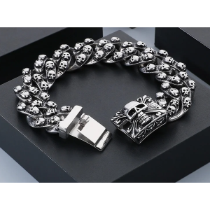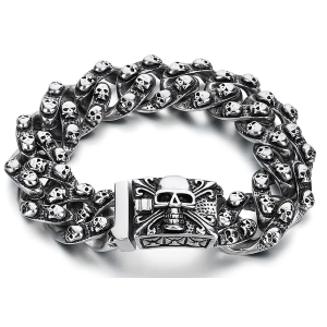 La catena a maglie cubane è interamente decorata con mini teschi tridimensionali, mentre la chiusura a scatola presenta un teschio più grande e dettagliato con un motivo a giglio.