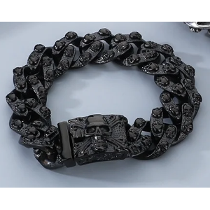 La catena a maglie cubane è interamente decorata con mini teschi tridimensionali, mentre la chiusura a scatola presenta un teschio più grande e dettagliato con un motivo a giglio.