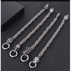 Bracciale con catena spessa bizantina con due teste di leone intagliate e dettagliate che si uniscono tramite un anello a molla.