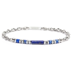 Bracciale in acciaio con catena marine con centrale cilindrico in pietra ai cui lati sono alternati elementi di acciaio, ematite e pietre. Lunghezza totale 21 cm, regolabile da 21 a 19 cm tramite logo tag Marlù in acciaio removibile.