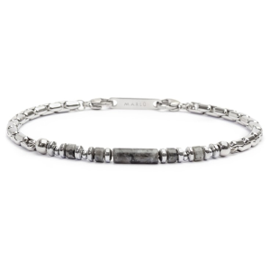 Bracciale in acciaio con catena marine con centrale cilindrico in pietra ai cui lati sono alternati elementi di acciaio, ematite e pietre. Lunghezza totale 21 cm, regolabile da 21 a 19 cm tramite logo tag Marlù in acciaio removibile.