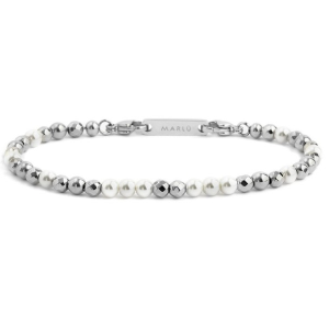Bracciale in acciaio con perle rivestite bianche, elementi di ematite pvd cromo, alternate ad elementi di acciaio lucido. Lunghezza totale 19 cm, regolabile da 19 cm 17,5 cm. Disponibile in acciaio, acciaio con pvd oro, acciaio con pvd rosè