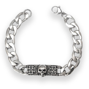Bracciale da uomo in acciaio inossidabile con catena a maglie Figaro e placca centrale con teschio e croci di ferro.