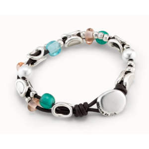Bracciale placcato argento Sterling formato da sottili strisce di cuoio decorate da diverse maglie d'argento, cristalli artigianali multicolore e un'elegante chiusura a bottone. Una creazione unica realizzata artigianalmente in Spagna. La collezione Grateful rappresenta un sentimento sottile e sofisticato. Il concentrarsi sulle cose belle della vita ed essere grati per ciò che si ha. Una sensazione trasferita al metallo e al cristallo, per plasmare gioielli organici e pieni di vita.