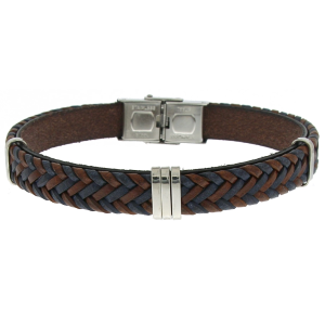 Bracciale in cuoio intrecciato bicolore marrone/blu e chiusura in acciaio. Cm 21