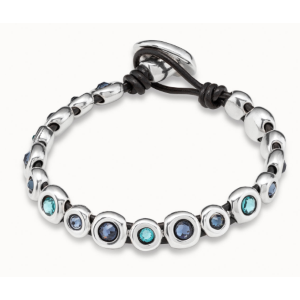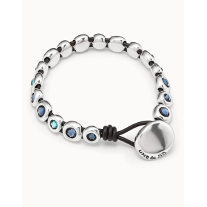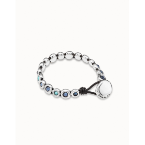 Bracciale con base di cuoio marrone e chiusura a bottone, ricoperto di lustrini di metallo placcato argento e cristalli di Swarovski di colore blu. Un design di UNOde50 prodotto in Spagna in modo artigianale al 100%.