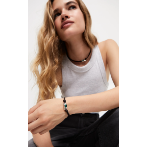 Bracciale in cuoio nero placcato argento con cristallo sfaccettato verde al centro. Prodotto in Spagna con un processo artigianale al 100%.Questi gioielli sono un’esposizione d’arte formata da bracciali, anelli, collane e orecchini e ogni gioiello è un’opera d’arte che ci presenta cristalli tagliati in stile smeraldo e pezzi con strati di forme geometriche. Scopri la collezione Ser magnetica.