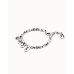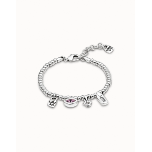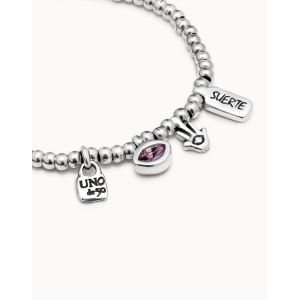 Bracciale placcato argento Sterling con svariati elementi perlati, dai quali pendono tre charm: il tipico lucchetto di UNOde50, un medaglione ovale con cristallo SWAROVSKI® ELEMENTS e la mano di Fatima. Realizzato completamente mano in Spagna da UNOde50.