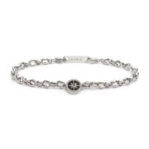 Bracciale in acciaio con catena marine con centrale tondo con rosa dei venti con black oil e al centro un cristallo nero. Lunghezza totale 21 cm, regolabile da 21 a 19 cm tramite logo tag Marlù in acciaio removibile. Materiali: acciaio, black oil, cristallo