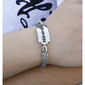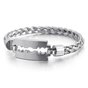 Questo bracciale con lametta di rasoio su acciaio intrecciato è chiaramente uno dei nostri preferiti! Infatti, la combinazione del motivo centrale a lama di rasoio con il braccialetto intrecciato in acciaio inox le conferisce uno stile moderno inimitabile. La lametta è lunga 3,2 cm e larga 1,6 cm. La circonferenza del braccialetto in filo inox ha un diametro di circa 6 cm. La sua natura leggermente flessibile ti permetterà di montarla perfettamente intorno al polso.