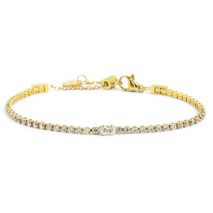 Bracciale con catena tennis 2 mm con cubic zirconia bianchi, con al centro baguette cubic zirconia bianco. Lunghezza totale 19 cm regolabile tramite cursore da 19 cm a 15 cm. Chiusura a moschettone. Marlù logo tag presente all' estremità. Collezione: BEW16