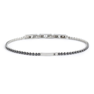 Bracciale con catena tennis con cubic zirconia con diametro 2 mm. Al centro una placca in acciaio con cubic zirconia sul lato. Lunghezza totale 19,8 cm, regolabile da 19,8 a 18,4 cm tramite chiusura a scatto removibile. Collezione: MAN06