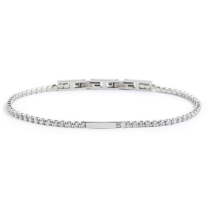 Bracciale con catena tennis con cubic zirconia con diametro 2 mm. Al centro una placca in acciaio con cubic zirconia sul lato. Lunghezza totale 19,8 cm, regolabile da 19,8 a 18,4 cm tramite chiusura a scatto removibile. Collezione: MAN06