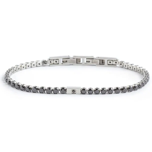 Bracciale con catena tennis con cubic zirconia con diametro 3 mm. Al centro una placca in acciaio con cubic zirconia al centro. Lunghezza totale 19,8 cm, regolabile da 19,8 a 18,4 cm tramite chiusura a scatto removibile.