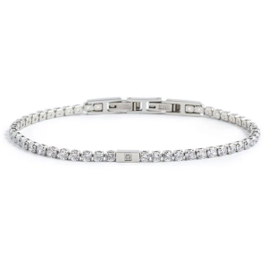 Bracciale con catena tennis con cubic zirconia con diametro 3 mm. Al centro una placca in acciaio con cubic zirconia al centro. Lunghezza totale 19,8 cm, regolabile da 19,8 a 18,4 cm tramite chiusura a scatto removibile.