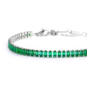 Bracciale con catena tennis con baguette cristallo nanometer verde. Lunghezza totale 19 cm regolabile tramite cursore da 19 cm a 15 cm. Chiusura con moschettone. Marlù logo tag presente all' estremità.