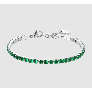 Bracciale tennis Donna in acciaio con cristalli verdi. Lunghezza: 15 + 3 cm. Misura cristalli: 3 mm. I cristalli verdi del bracciale rappresentano la rigenerazione, la vitalità e la crescita, trasmettendo un senso di armonia e equilibrio. Indossare questo bracciale non è solo una dichiarazione di stile, ma anche un modo per connettersi con la natura e i suoi cicli di rinnovamento.