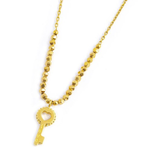Collana in acciaio con pvd oro con ematite sfaccettata nella parte frontale. Pendente a forma di chiave con misura 0,7*1,4 cm, sul fronte cristalli bianchi. Sul retro la scritta "love". Marlù logo laserato sul lato. Lunghezza totale 44 cm regolabile tramite cursore cilindrico con silicone. Marlù logo tag presente all'estremità. Materiali: acciaio, ematite, pvd oro, cristalli Collezione: TMT24