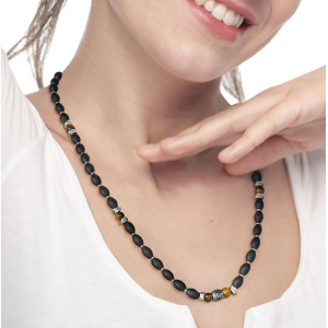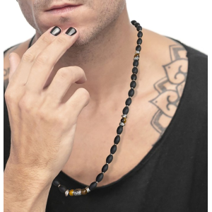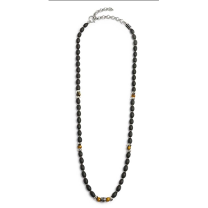Collana in acciaio con onice nera ovale, con sfere di occhio di tigre e con anelli in acciaio. Elemento centrale in acciaio a forma cilindrica con trama con black oil. Ad una estremità elemento triangolare in acciaio con trama in black oil, logo Marlù e la parola Namastè, collegato ad estensione con catena rolò con trama, removibile e/o regolabile tramite moschettoni tondi. All'altra estremità chiusura con moschettone tondo. Lunghezza totale 70 cm, regolabile da 70 a 60 cm. Materiali: acciaio, onice, occhio di tigre, black oil