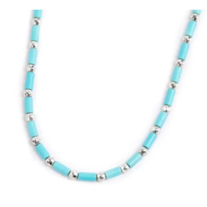 Collana con perline a tubo turchesi alternate ad elemento sfaccettato in ematite. Su una estremità si trova una tag ovale vicino al moschettone con scritta "make a wish" su entrambi i lati e sull'altra estremità è presente la tag tonda con logo Marlù. Lunghezza totale 44 cm regolabile tramite cursore da 44 cm a 34 cm.