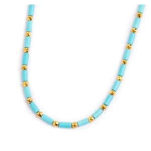 Collana con perline a tubo turchesi alternate ad elemento sfaccettato in ematite. Su una estremità si trova una tag ovale vicino al moschettone con scritta "make a wish" su entrambi i lati e sull'altra estremità è presente la tag tonda con logo Marlù. Lunghezza totale 44 cm regolabile tramite cursore da 44 cm a 34 cm.