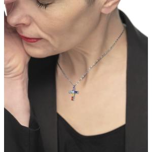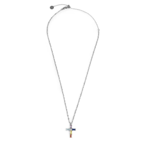 Collana in acciaio con croce pendente 1,4*2,3 cm con cristalli baguette e al centro un cubic zirconia bianco. Lunghezza totale 50 cm, regolabile tramite cursore. Marlù logo laserato sul lato della croce. Materiali: acciaio, cristalli baguette, cubic zirconia