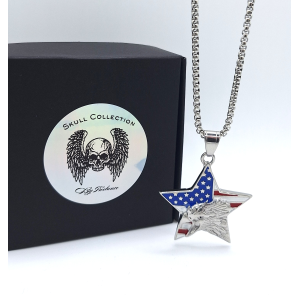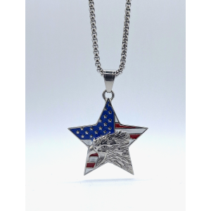 Collana da uomo con ciondolo a forma di stella con aquila e bandiera americana, in acciaio inossidabile. Il ciondolo presenta un'aquila calva in rilievo posizionata sopra la bandiera degli Stati Uniti smaltata, con la parte inferiore decorata da strass o zirconi cubici.
