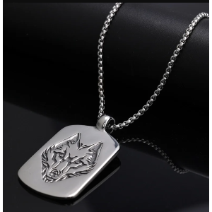 Design: Il ciondolo è una piastrina rettangolare in stile militare con un'incisione in rilievo della testa di un lupo, in stile vichingo, nordico, tribale o punk.