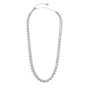 Collana con doppia catena: la prima è una catena snake quadrata con larghezza 1,10 mm. La seconda è una catena grumetta con sfere pendenti. Lunghezza totale 50 cm regolabile tramite cursore da 50 cm a 40 cm. Marlù logo tag presente all' estremità.