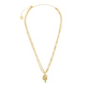 Collana con doppia catena: la prima è una catena snake quadrata, la seconda è una catena a grumetta con sfere al cui centro è presente un pendente a forma di serpente con cubic zirconia taglio marquise verde e trama in rilievo. Lunghezza totale 44 cm regolabile da 44 a 34 cm tramite cursore. Marlù logo tag presente all'estremità.