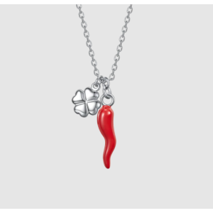 COLLANA IN ACCIAIO QUADRIFOGLIO E CORNETTO SMALTATO ROSSO PORTA FORTUNA