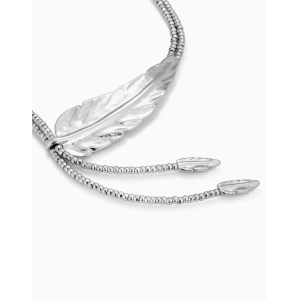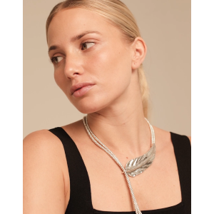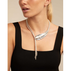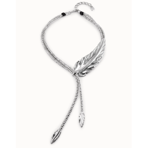 Collana lunga placcata argento e rifinita con piccole piume. Sul lato integra un elemento di maggiori dimensioni, sempre a forma di piuma, protagonista della collezione Crush. Un design innovatore di UNOde50 prodotto in Spagna e artigianale al 100%.