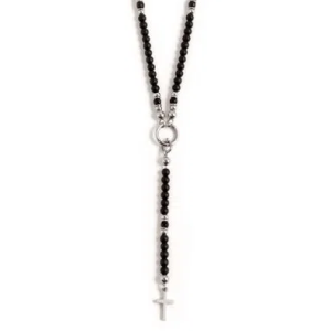 Collana a "Y" in acciaio con pietra onice liscia e sfacettata, pietra composita azzurro turchese ed elementi in acciaio. Al centro si trova un anello in acciaio pinzato al quale è agganciata un'estensione removibile, il pendente finale è a forma di croce. Lunghezza collana 60 cm regolabile tramite tag removibile.