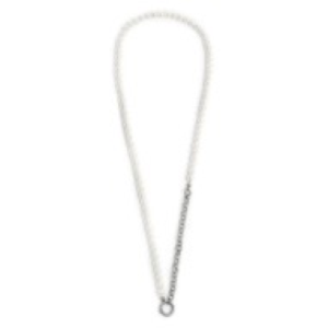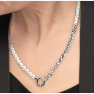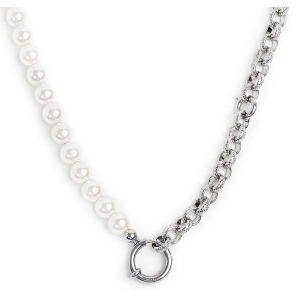 Collana in acciaio con catena di perle a sfera rivestite con misura 6,20 mm. Chiusura con moschettone con diametro 1,2 cm. Estensione con catena rolò con trama, removibile e/o regolabile tramite moschettone tondo al centro. Lunghezza totale 60 cm, regolabile da 60 cm a 50,5 cm.
