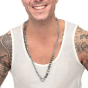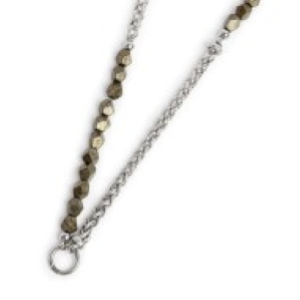 Collana in acciaio con catena con pietre di pirite, catena a sonaglio e catena rolò con trama. Ad una estremità elemento rettangolare in acciaio con trama in black oil, sul fronte il logo Marlù, su retro la parola Namastè. Estensione con catena rolò con trama, removibile e/o regolabile tramite moschettone tondo al centro. Materiali: acciaio, pirite