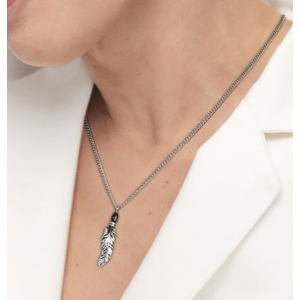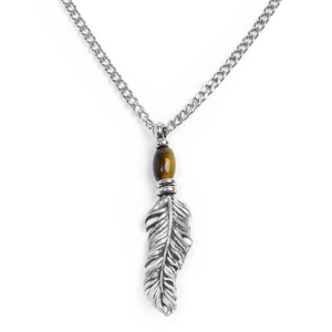Collana in acciaio con catena a grumetta, con pendente a forma di piuma con black oil opaco, collegato a occhio di tigre ovale. Lunghezza totale 70 cm, regolabile a 60 cm, a 50 cm, a 70 cm. Materiali: acciaio, occhio di tigre, black oil