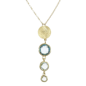 Design a pendente con disco satinato e tre cristalli degradè sfaccettati (tonalità acquamarina). Lunghezza cm 40+5, catena sottile con chiusura a moschettone.