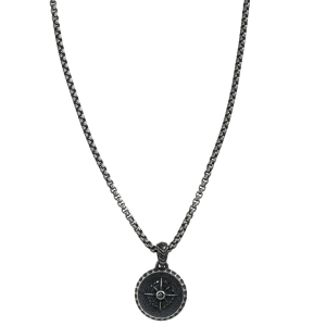 Collana uomo con un ciondolo rotondo con un design a rosa dei venti (windrose) al centro con zirconi neri, stile minimalista ma resistente. Il gioiello ha una finitura nera per avere un'effetto "invecchiato", ottenuta tramite uno speciale rivestimento PVD, che lo rende più resistente rispetto ai pezzi placcati convenzionalmente. Collana è realizzata in acciaio chirurgico 316L, che la rende ipoallergenica, super resistente e mantiene la sua lucentezza senza macchiare la pelle, impermeabile e adatto per l'uso sotto la doccia, in mare, in piscina o durante l'attività fisica. Ideale per l'uso quotidiano.