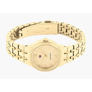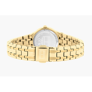 L'orologio si distingue per la finitura satinata del quadrante effetto solare, mentre il cinturino a maglie oro ne esalta lo stile.