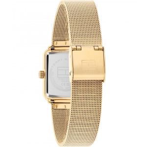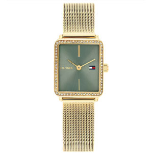 Questo è un orologio da polso da donna Tommy Hilfiger con un braccialetto in rete in acciaio inox dorato e un quadrante verde quadrato. La cornice è adornata da piccoli cristalli, aggiungendo un tocco di eleganza. Il quadrante è minimalista, con sottili marcatori e lancette dorate, e il logo della bandiera Tommy Hilfiger posizionato alle 3. Il braccialetto a rete ha un aspetto raffinato e moderno, e l'orologio probabilmente è alimentato da un movimento al quarzo per una misurazione precisa del tempo.