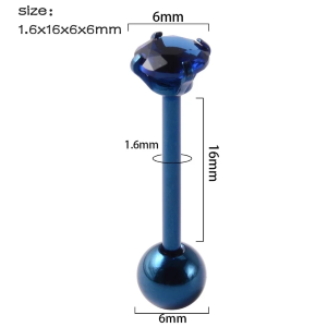 Piercing per la linugia, a forma di bilanciere con zircone nella parte superiore, ed una sfera di 5mm nella parte inferiore. Realizzato in acciaio 304.