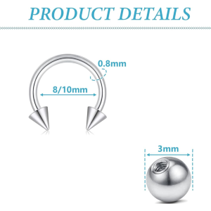 Con una lunghezza che varia dagli 8 ai 16 mm e uno spessore da 1 a 6 mm, si adatta perfettamente a una varietà di piercing, inclusi daith, orecchio, intimo, capezzolo, naso, rook e setto. La forma a ferro di cavallo con punte a spillo offre un design unico che si distingue, aggiungendo un tocco di stile inconfondibile al tuo look.