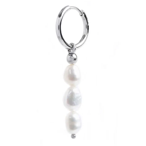 Mono orecchino in acciaio a cerchio con diametro 1,6 cm, con pendente con 3 perle bianche rivestite irregolari. Lunghezza totale 5 cm.