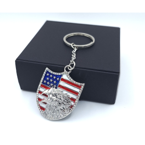 Portachiavi a forma di stemma arrotondato con aquila e bandiera americana, in acciaio inossidabile. Il ciondolo presenta un'aquila calva in rilievo posizionata sopra la bandiera degli Stati Uniti smaltata, con la parte inferiore decorata da strass o zirconi cubici.